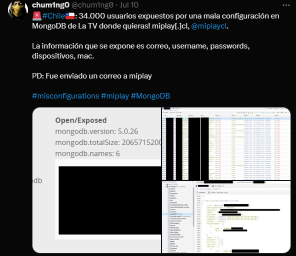 La empresa de telecomunicaciones Miplay expuso un MongoDB, que exponía cerca de 34.000 cuentas de usuarios, entre esos datos se exponían usuarios, passwords, correos, dispositivos, mac, etc.