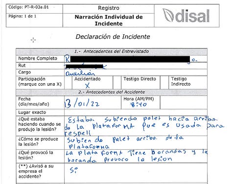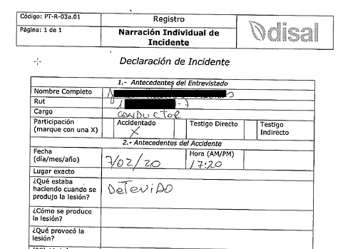 Otros documentos mostraban en sus títulos Declaración de incidente. Algunos registros mostraban nombres, RUT, cargo y descripciones del incidente de los trabajadores.